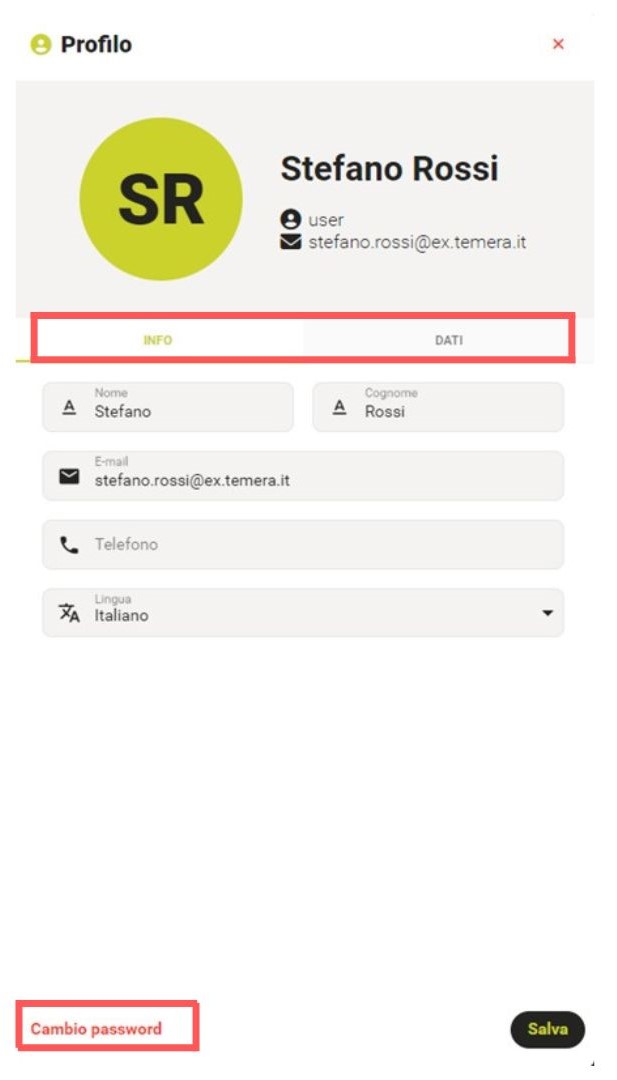 Da qui puoi cambiare il tuo nome, mail, lingua di default e password:
