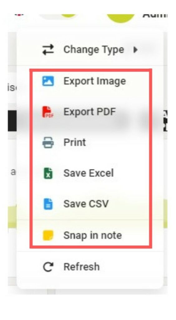 È possibile esportare i dati da grafici e tabelle cliccando sul bottone evidenziato a destra del nome del modulo e selezionando il formato desiderato: